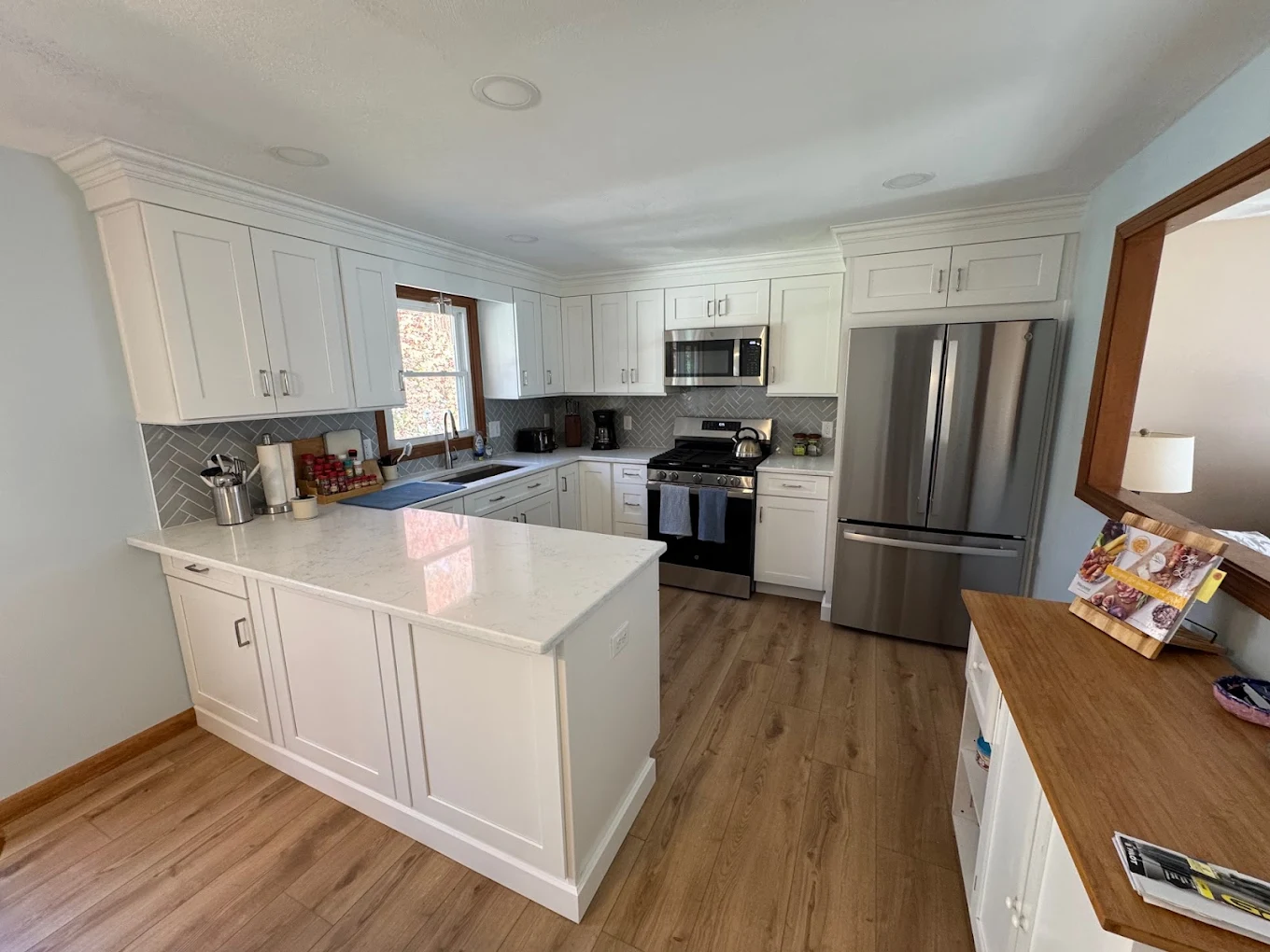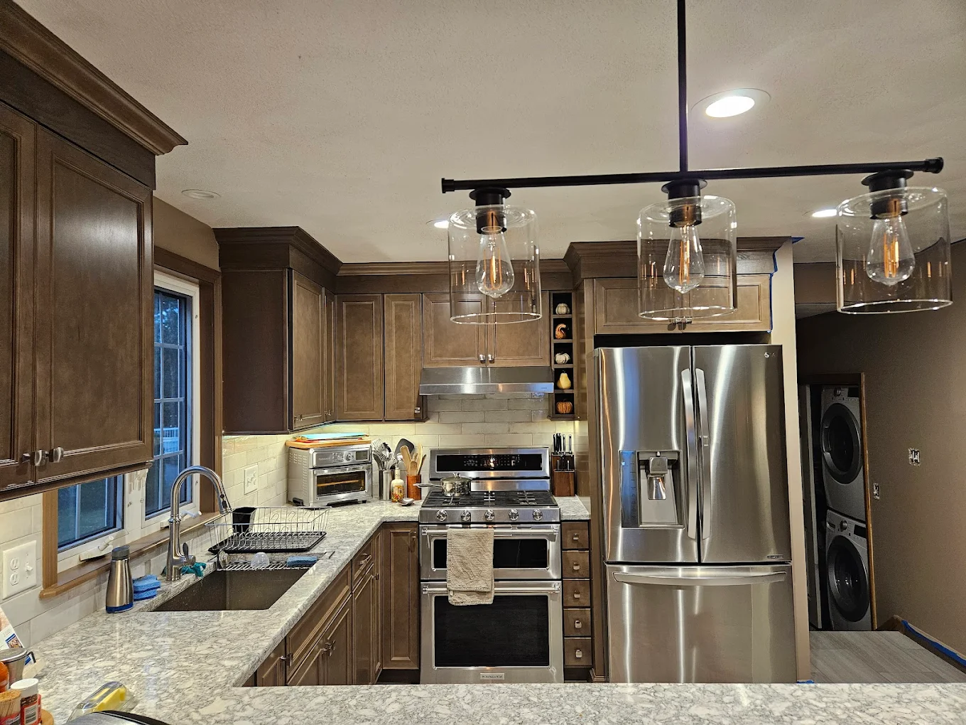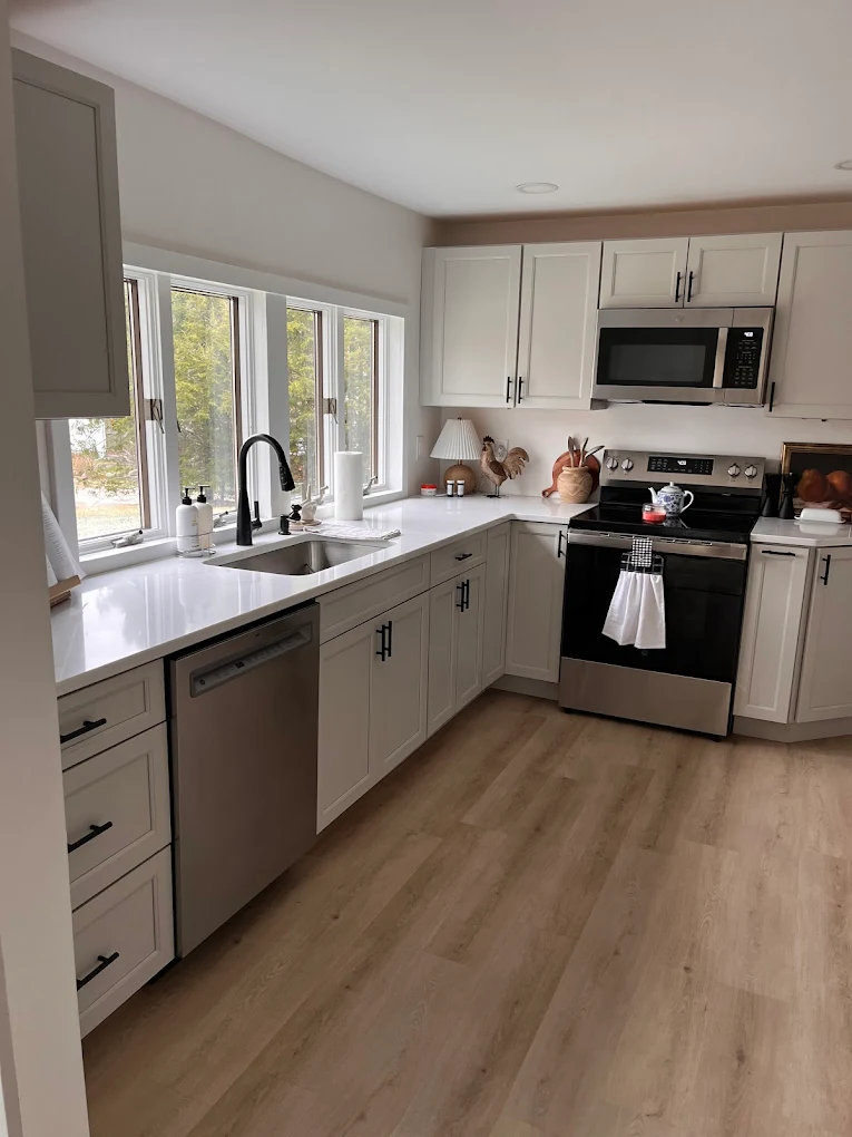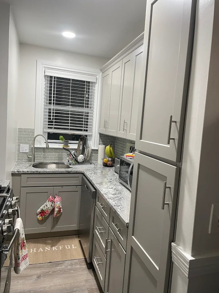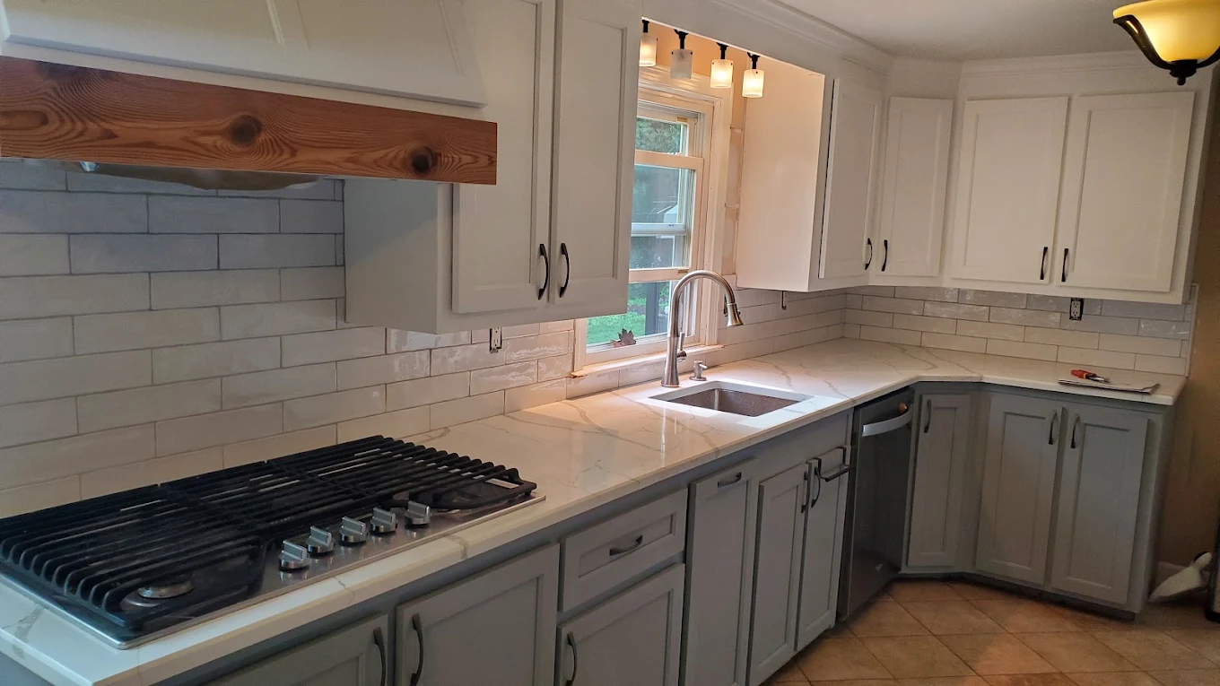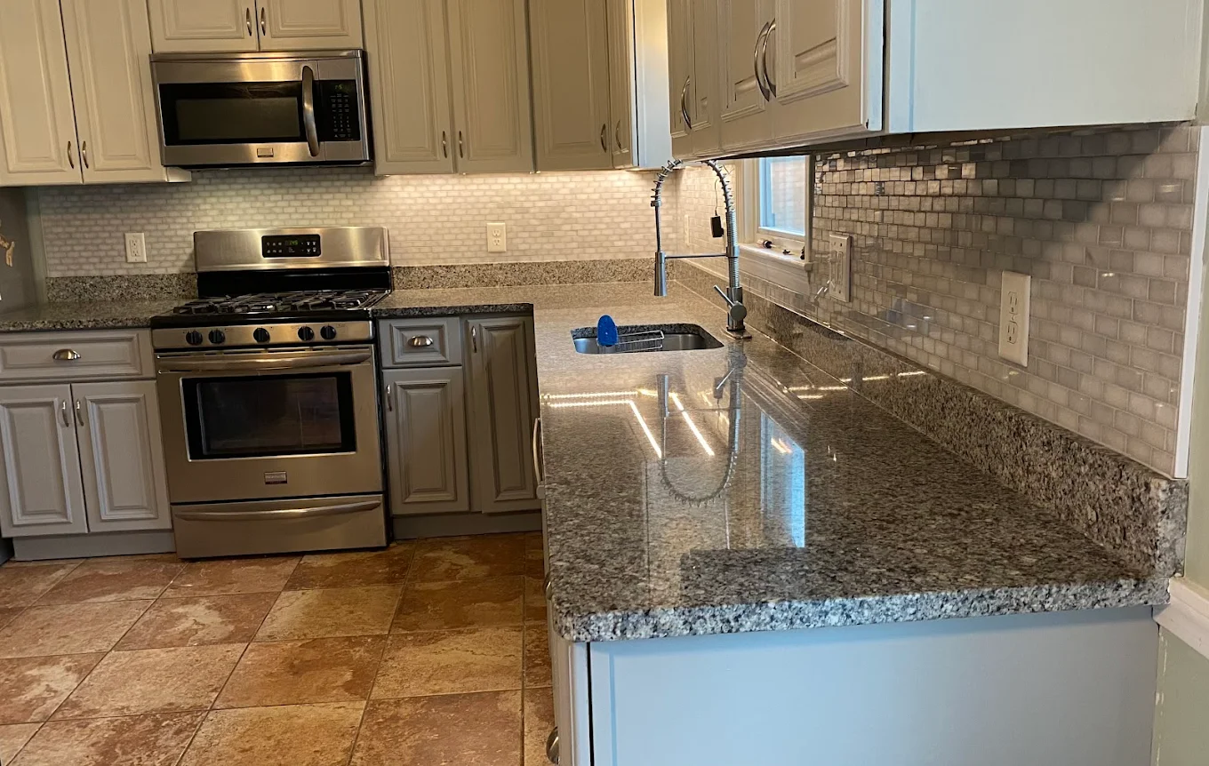 New cabinets, hardware, countertops, and backsplash installed cleanly and correctly.