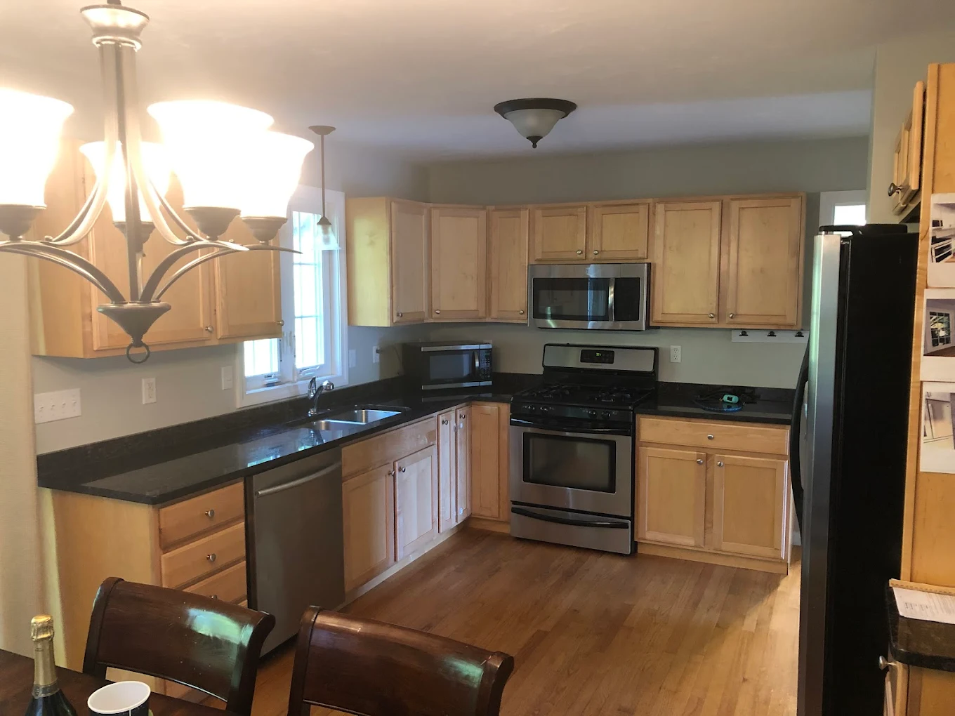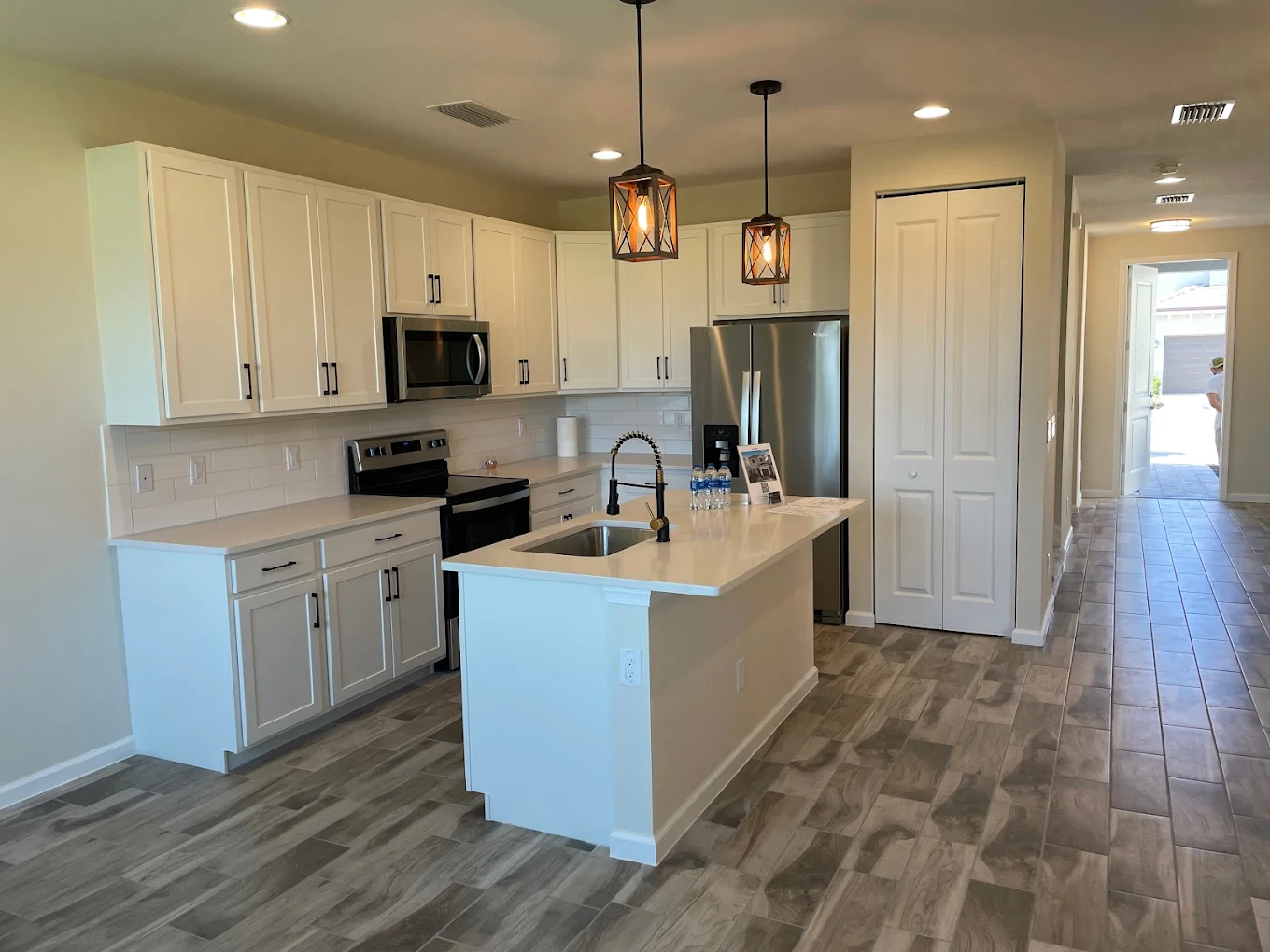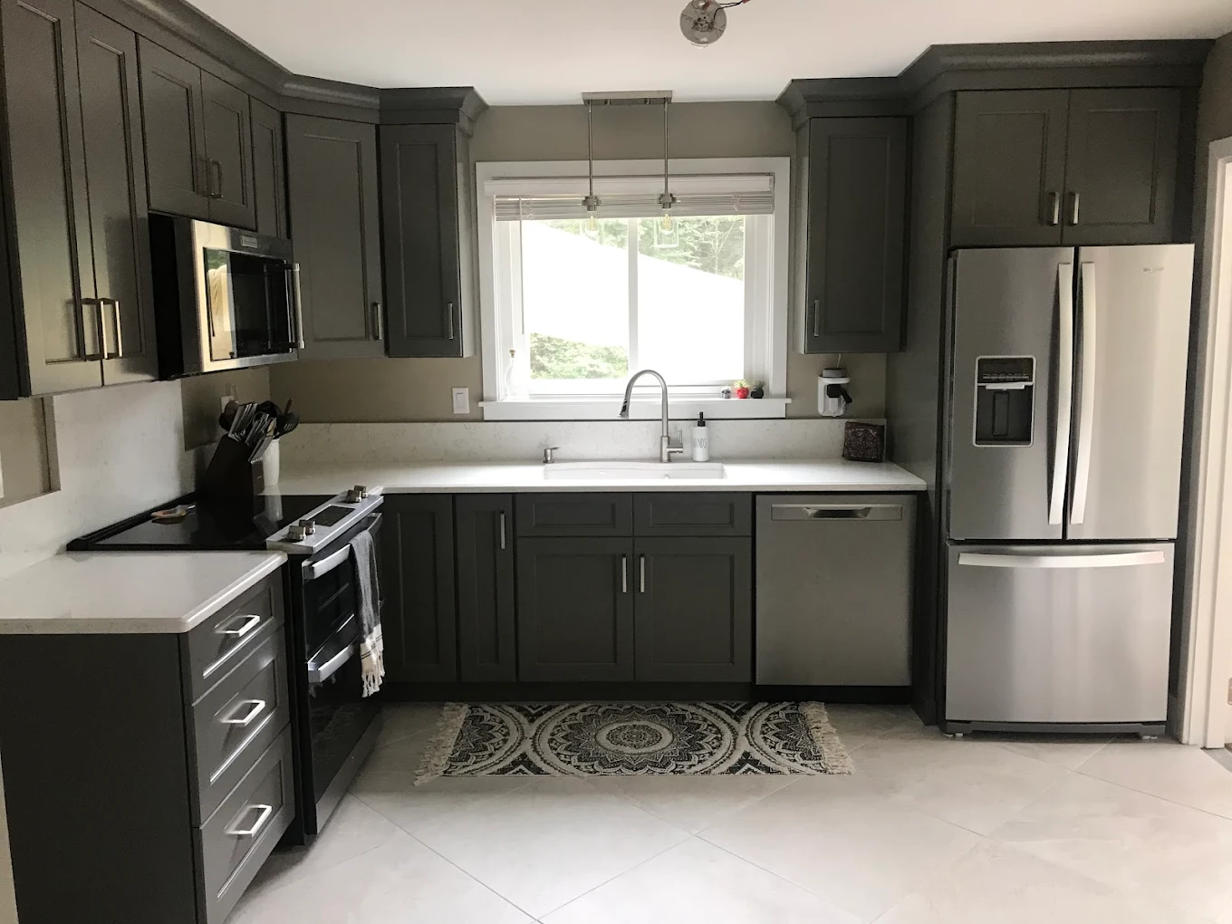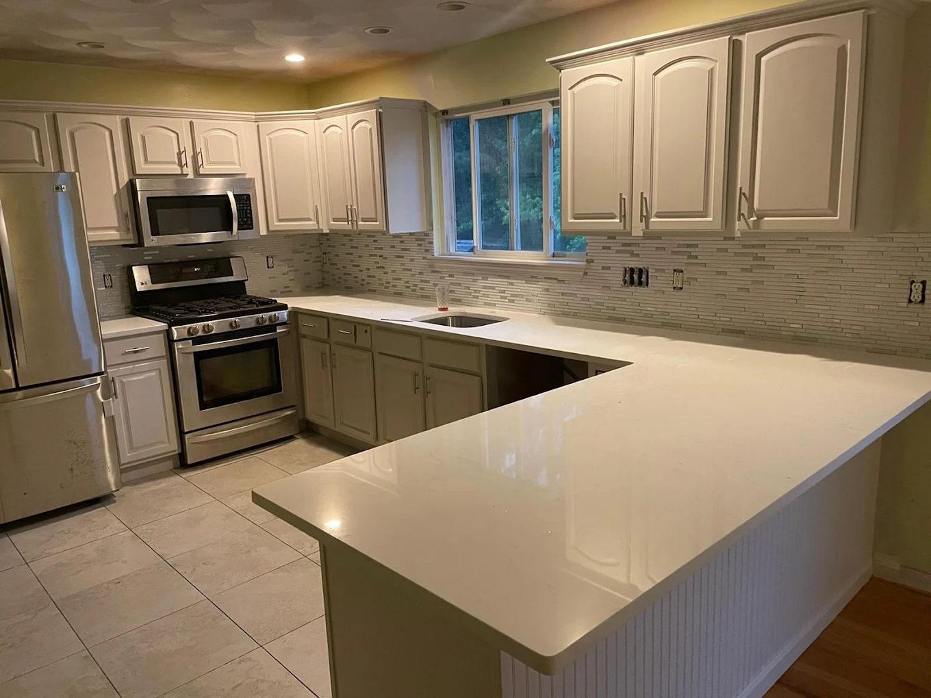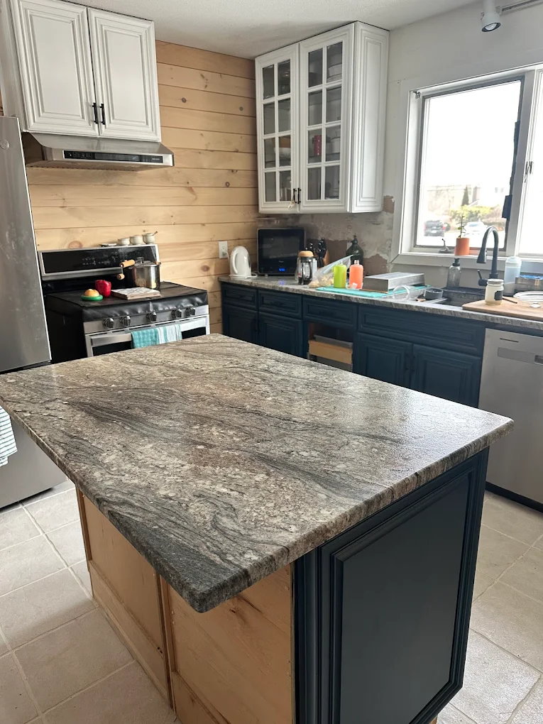 New cabinets, hardware, countertops, and backsplash installed cleanly and correctly.